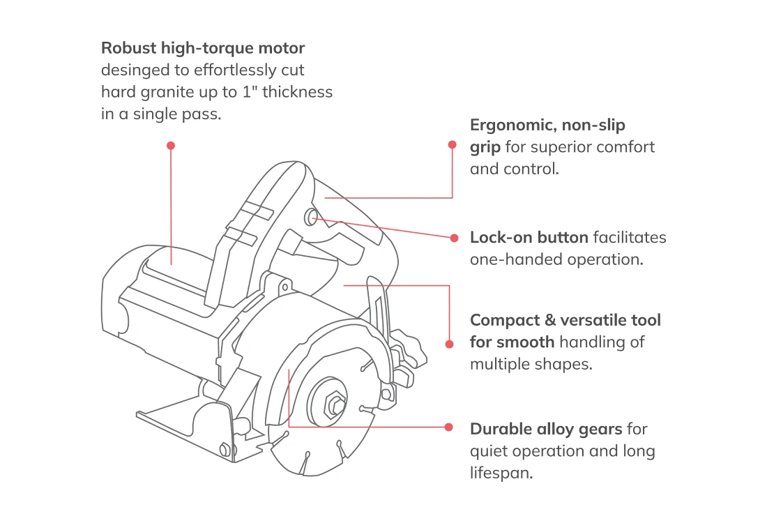 The CUMI CPTC 110-1350W professional series tile cutter delivers precision cutting for granite, tile, and wood. Its 1350W high-torque motor and 12,000 RPM blade speed ensure smooth, efficient performance. With durable alloy gears, an ergonomic grip, and a lock-on button, it offers seamless handling and fatigue-free operation.